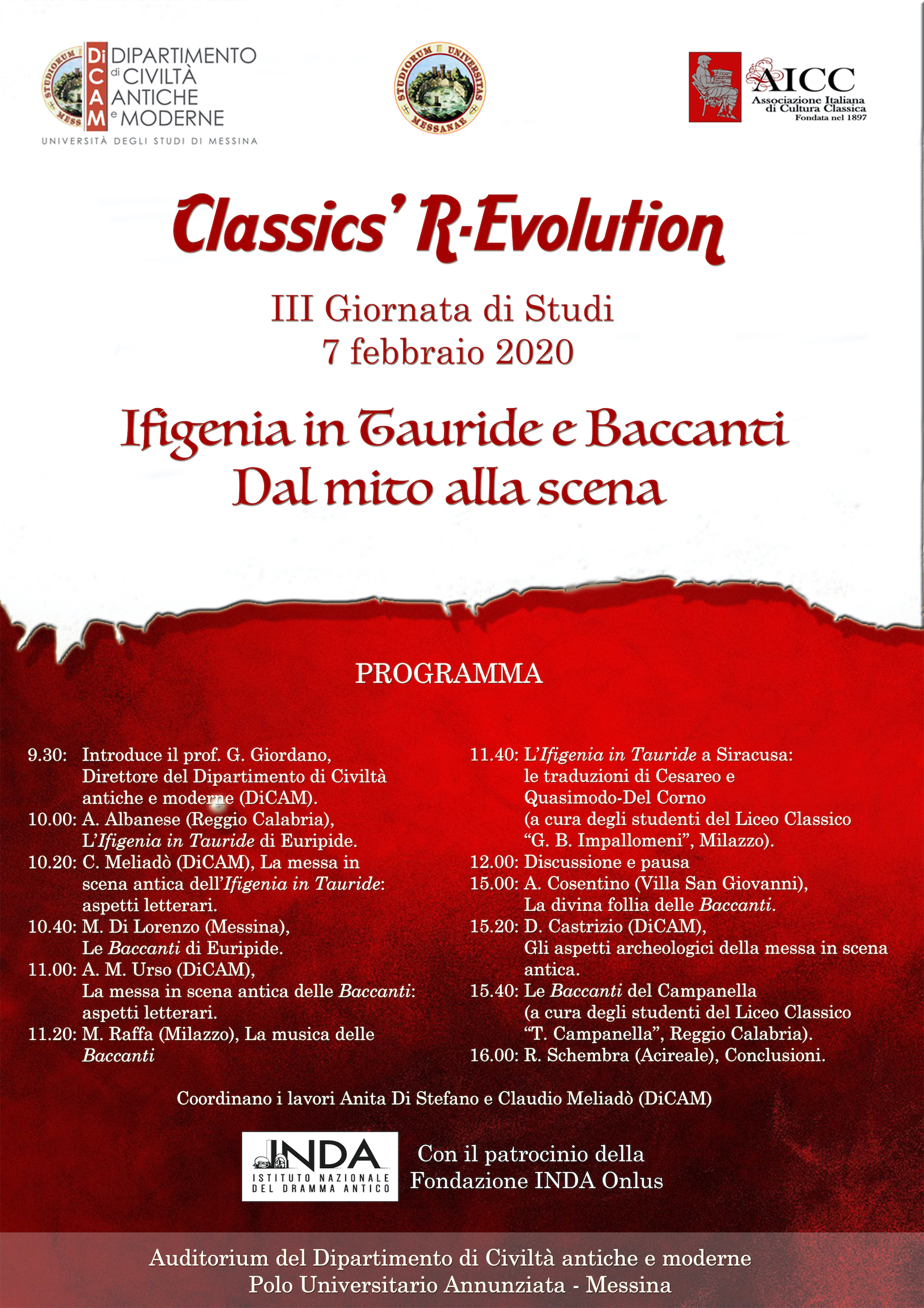 La Giornata di Studi, coordinata dai proff. Anita Di Stefano e Claudio Meliadò, vede la partecipazione come relatori di studenti e docenti della scuola superiore e di docenti universitari. L’incontro rientra nel percorso di lettura, promosso in collaborazione con varie delegazioni dell’Associazione italiana di Cultura Classica, che mira a indagare i testi classici, dalla loro creazione letteraria alle forme e alle motivazioni della loro fortuna antica e moderna, manifestata mediante iconografia, riprese, riscritture, filmografia, messa in scena.